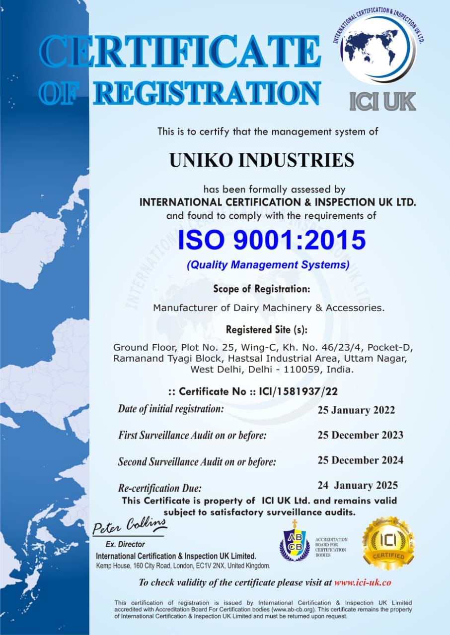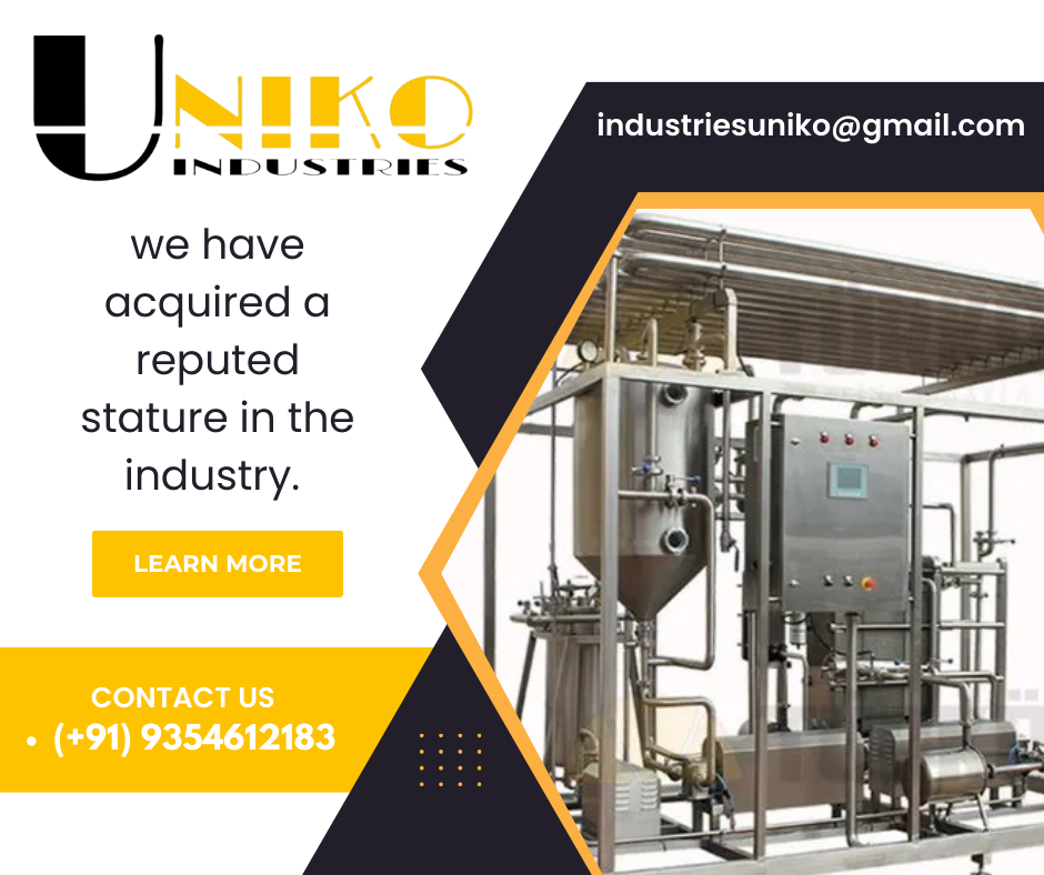 Established in 2018, Uniko Industries is involved in the area of manufacturing a broad plethora of Dairy Processing Plant Machines. In their development process, we assure that only top notch material is used by our professionals along with modern machinery. Besides this, we check these on a variety of grounds before finally shipping them at the destination of our customers.